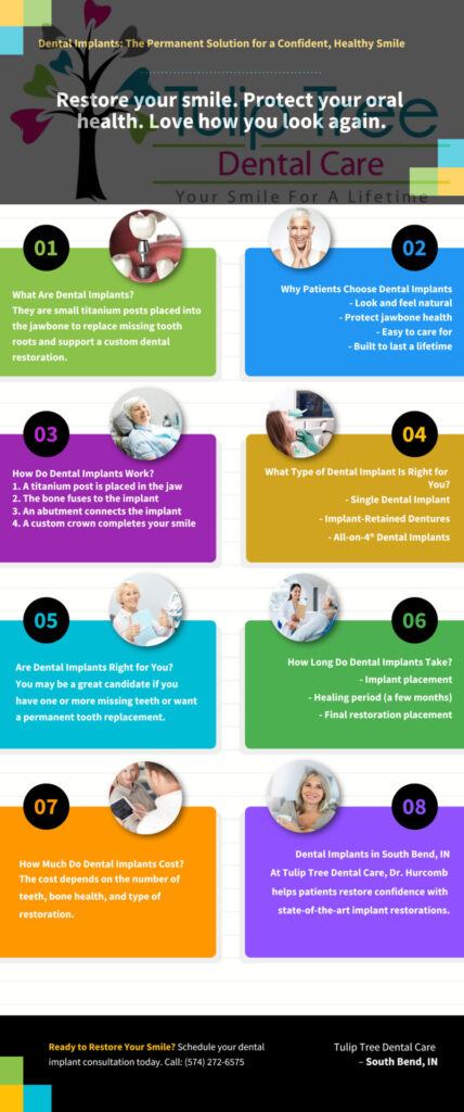 At Tulip Tree Dental Care, patient comfort comes first. Our bright, modern office, upbeat music, and caring staff create a calm environment designed to ease dental anxiety. We proudly offer family dentistry, cosmetic services, restorative care, emergency appointments, and Spark™ Clear Braces—making quality dental care convenient for South Bend and surrounding communities.